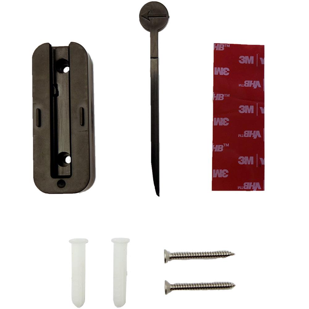 Obsah krabičky: držák, klíč, 3M páska, šroubky (2x), hmoždinky (2x)